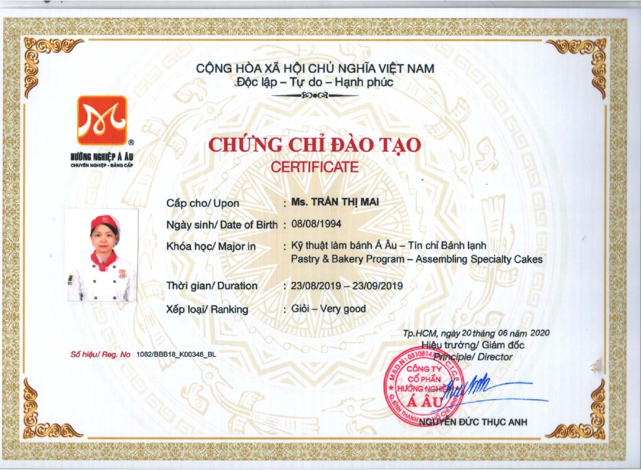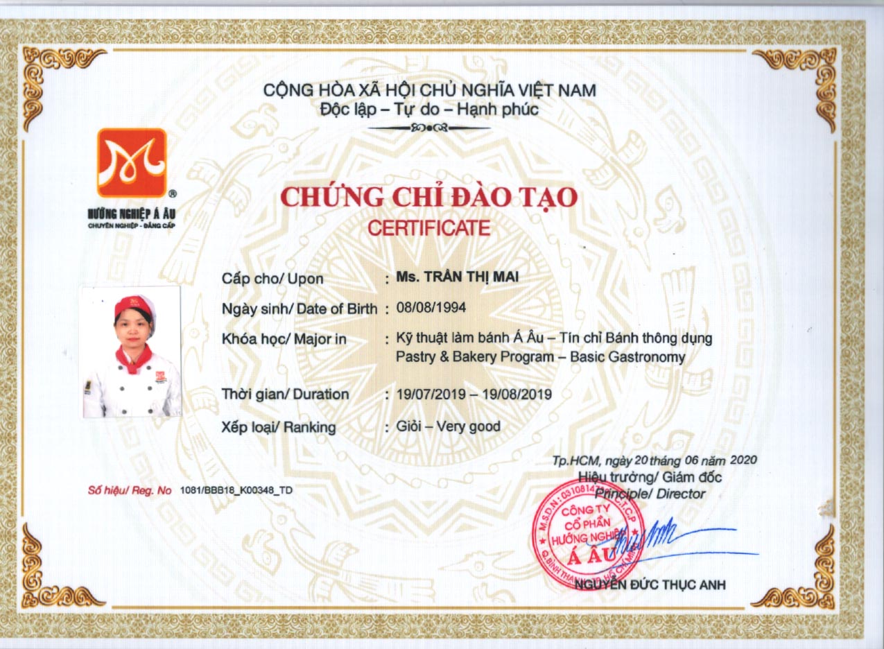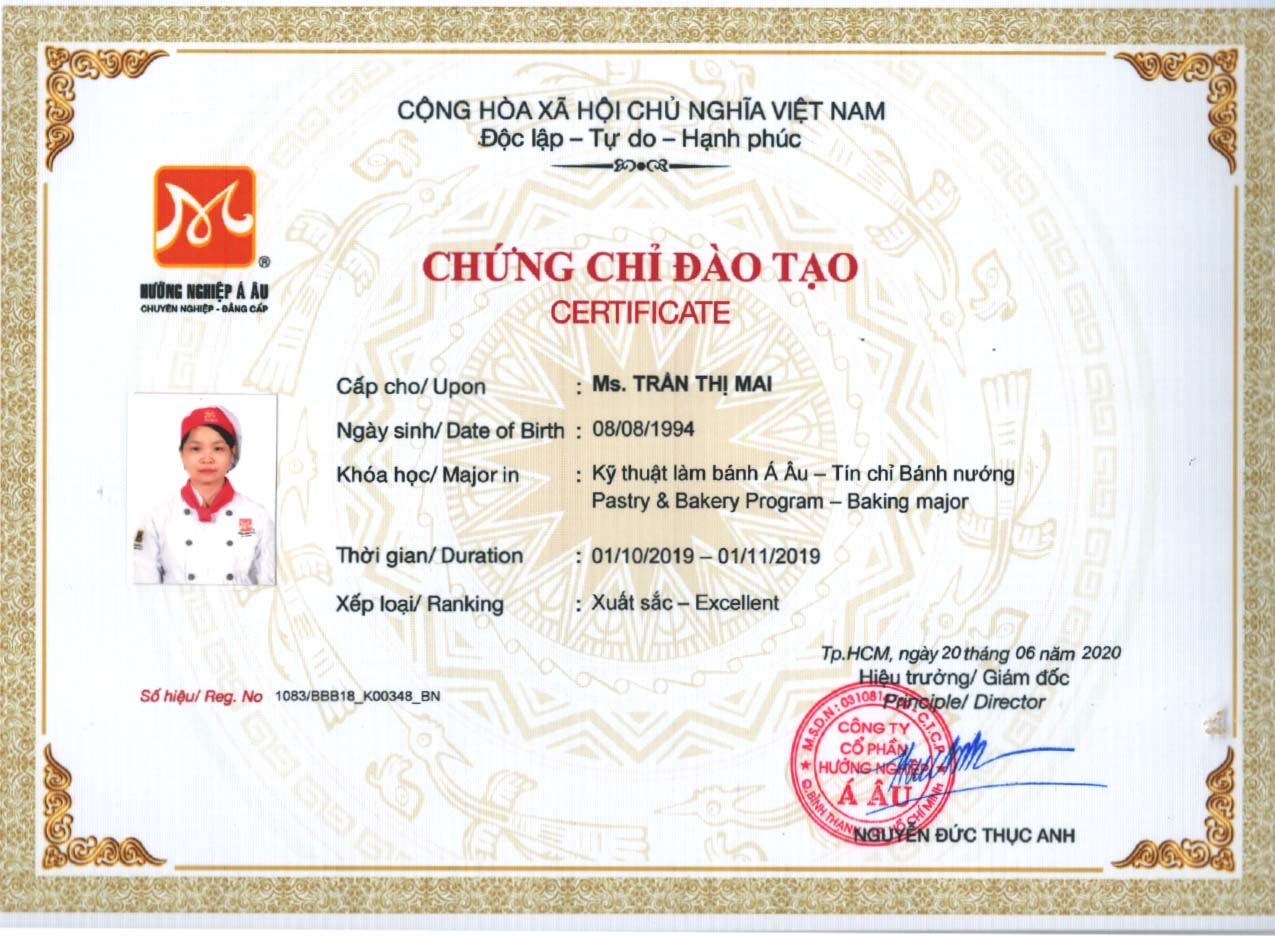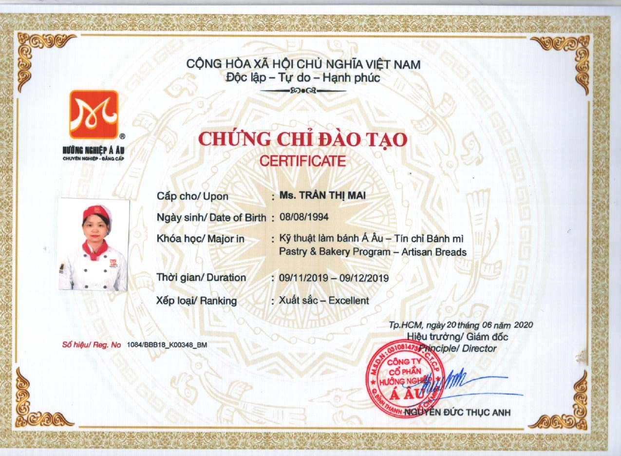 - Ngày 09/08/2019: Chứng nhận đào tạo số 1081/ BBB18 _ K00348_ TD kỹ thuật làm bánh Á Âu - Tín chỉ bánh thông dụng.