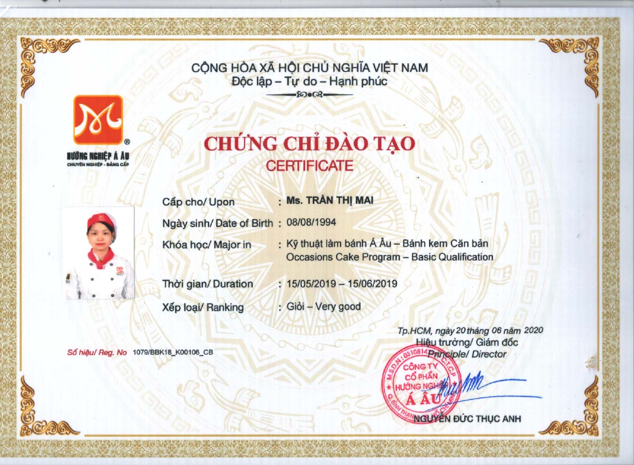 - Ngày 15/06/2019: Chứng nhận đào tạo số 1079/ BBk18 _ K00106_ CB kỹ thuật làm bánh Á Âu - Bánh kem căn bản.